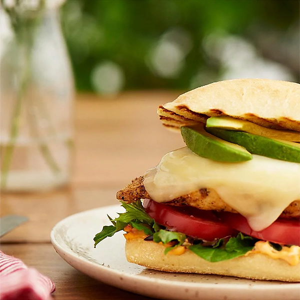 Ingrediente: burger de pui la grătar, salată verde, roșii, castraveți murați, sos hamburger, brânză cedar Gramaj: 340g