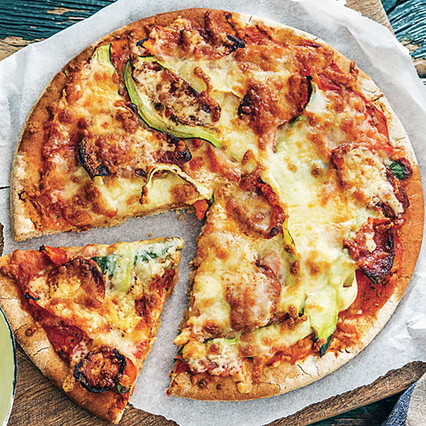 Ingrediente: sos de pizza, mozzarella, gorgonzola, cașcaval, cașcaval afumat, salam picant