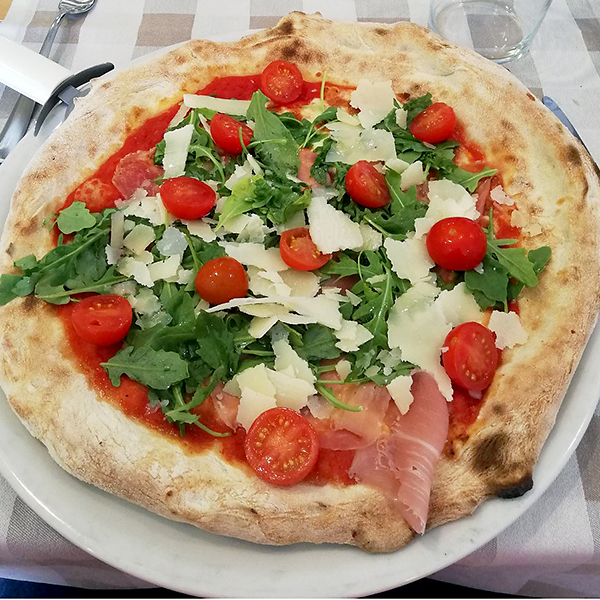 Ingrediente: sos de pizza, mozzarella, gorgonzola, rucola, prosciutto crudo, roșii chery, parmezan Mărimi: 32cm/490g 40cm/860g 60cm/1710g
