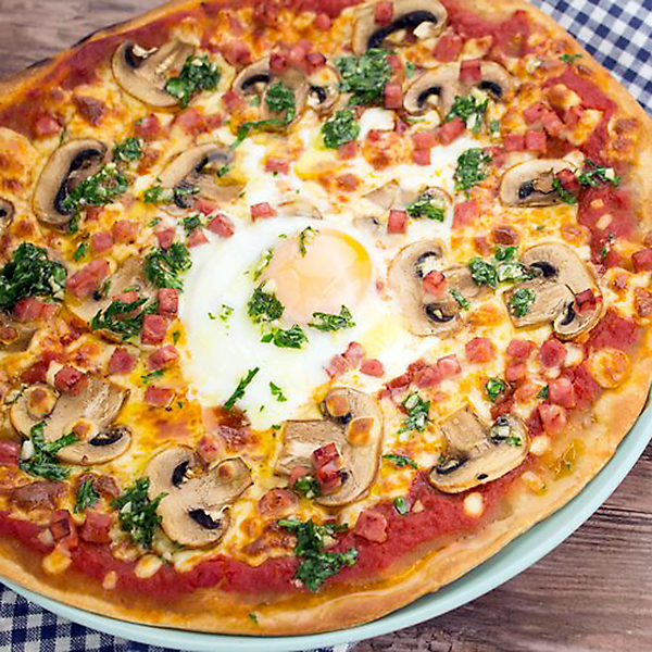 Ingrediente: sos de pizza, mozzarella, șuncă, cârnați, salam, ciuperci, bacon, ou, usturoi, ceapă roșie